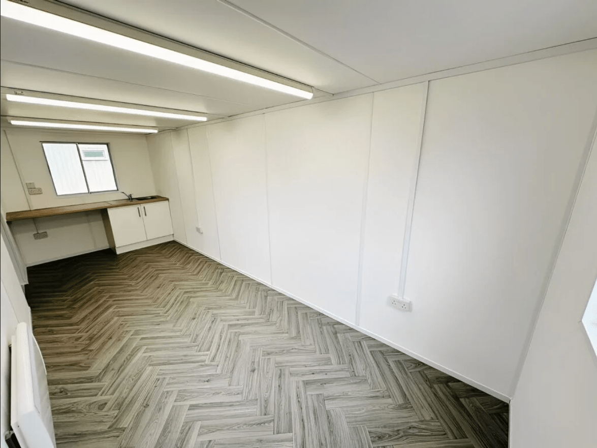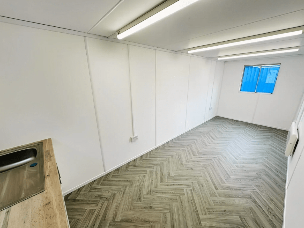 Featuring a fully fitted kitchenette, Silver Oak Herringbone vinyl flooring, LED lighting, and a complete electrical system, this cabin is ideal for construction sites, project offices, or staff canteen areas.