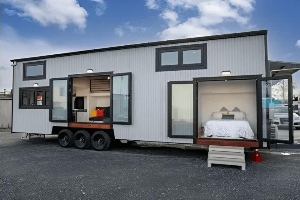 - Built on a 3-axle American-style trailer, this prefab house is fully mobile and towable with a compatible vehicle.