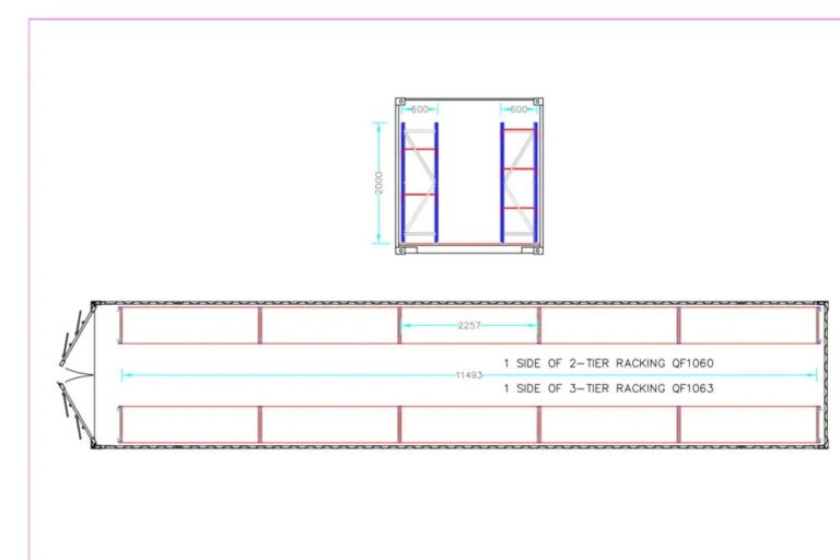 For the provision of racking in the container end, we offer a single bay of 1850mm three tier racking that can be assembled in the container. It comprises two pre-assembled 2m high and 600mm wide end frames connected by 2 beams per shelf. The beams easily slot into the end frames and include safety clips. All steel items are powder coated (blue and orange) for a scratch resistant finish and include a 25mm chipboard shelf with a capacity of 550kgs per shelf, the shelf height is adjustable in 50mm increments.It is possible to use racking on both sides of the 40ft container (choice of two or three tier). However in the 40ft there is not enough space for racking on the end of the container when using the racking down the 40ft sides . If you only want racking at the end of the container you can use two tier racking for container rear or three tier racking for container rear . See the racking diagram download for more details.This racking can also be used alone in any container.